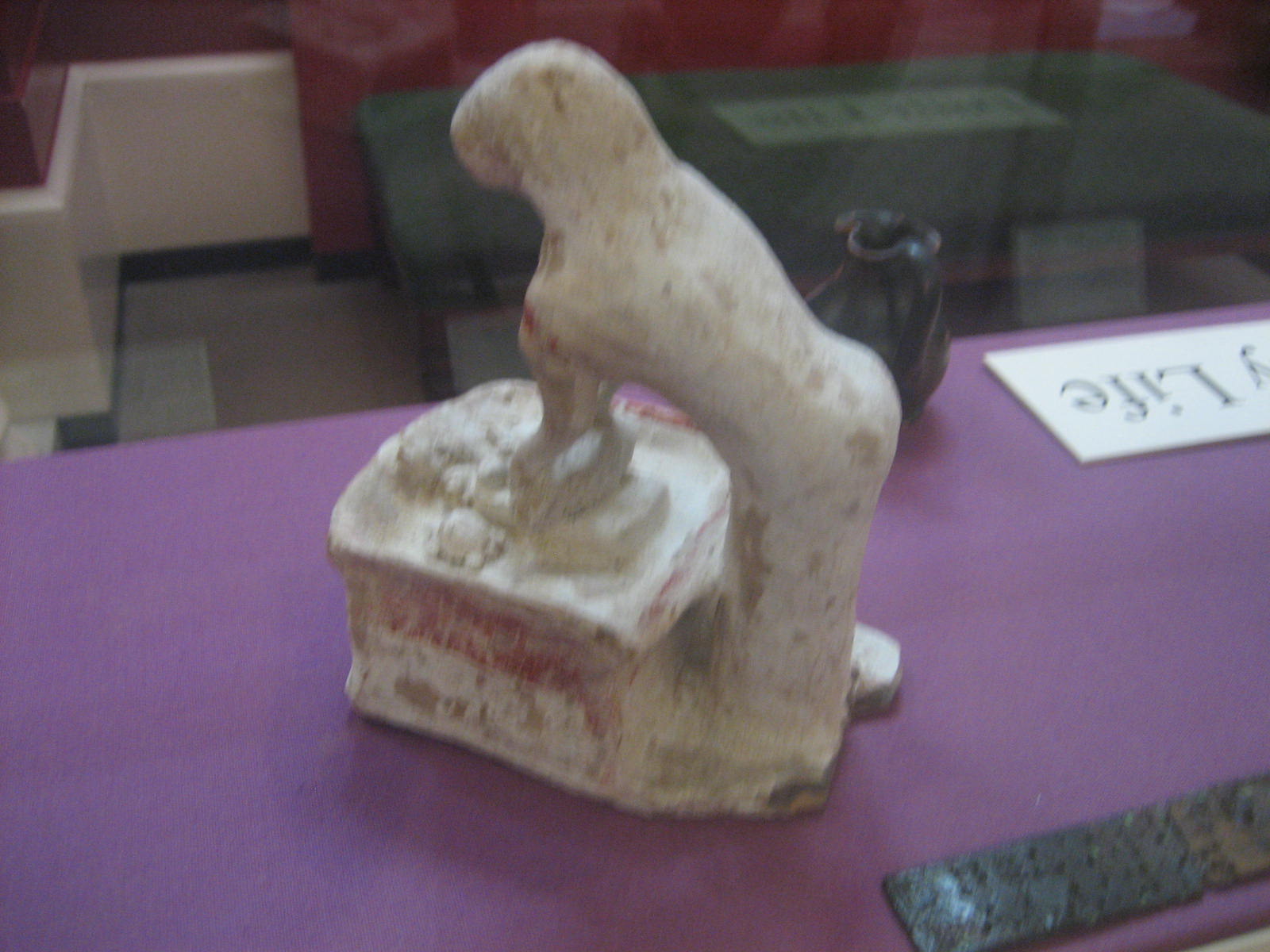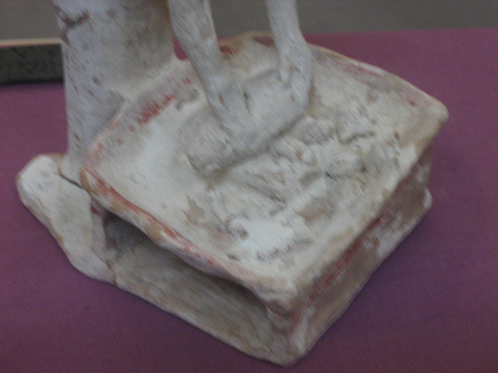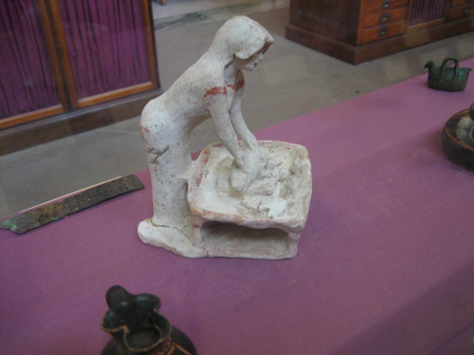 I’m always looking out for anything that sheds light on grinding with a saddle quern (or a metate as it would be called in Mexico). Museums often have some dusty exhibits in a corner. Just a couple of days ago I was in the marvelous Ashmolean Museum in Oxford. In an exhibit of Greek artifacts, there was a charming little model, just about six inches high, of a Greek woman grinding in the 5th century BC. Actually the sign said she was kneading but that was clearly wrong. She is leaning over a saddle quern holding the muller in both hands. Or at least I think she is. Assuming the sculptor got things right, it’s actually rather a puzzling little model when you examine it closely.