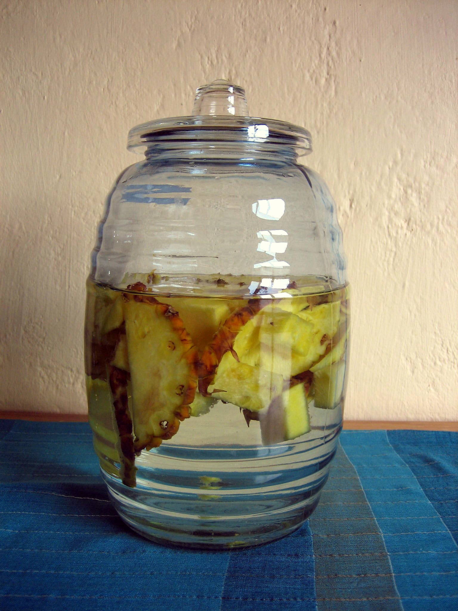 Tepache is also commonly made at home. It’s not difficult and it’s actually a great trick for using up that mountain of trimmings and core that always result from preparing pineapple. You just take the lot (making sure of course that you washed the outside before trimming), put them in a glass container (plastic is not good for this), add water and wait four or five days.
