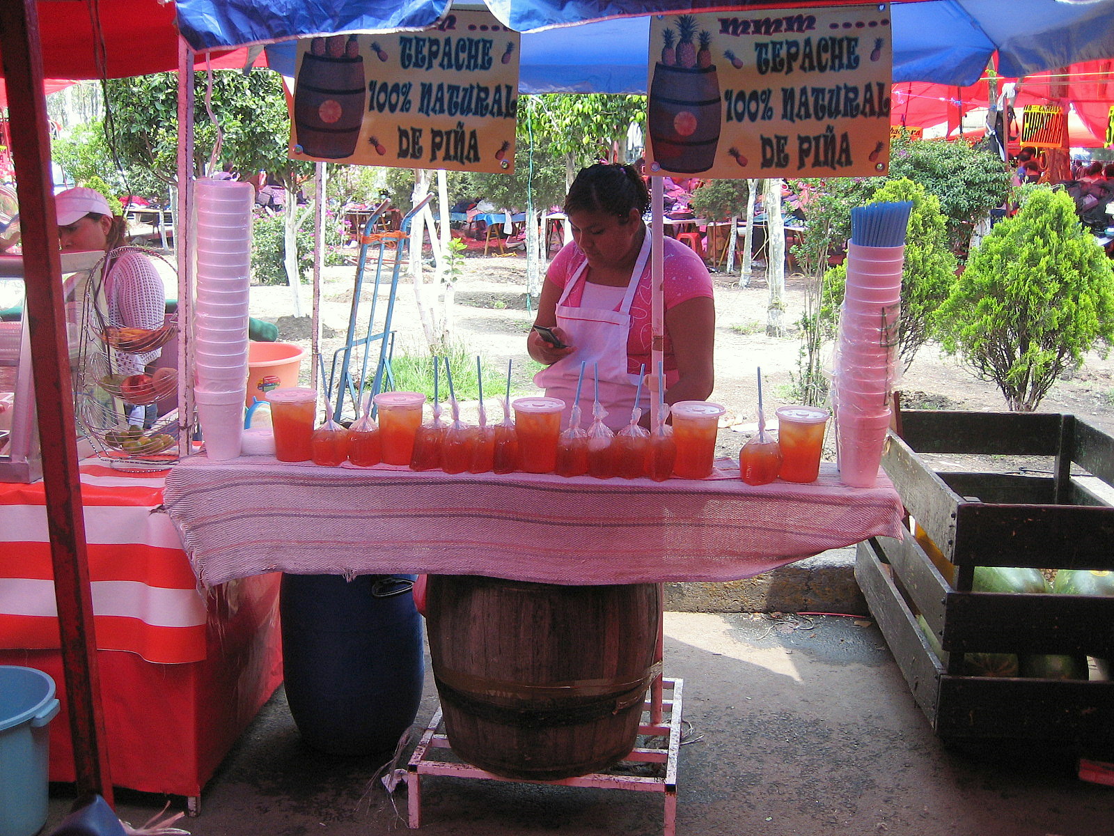 But I’m drinking tepache. So what’s tepache? It’s a Mexican drink. If you are a visitor, you might see it on the outskirts of towns, a wooden barrel with TEPACHE in wobbly red letters, under the awning of a little cart, or in a market as here, with the 30 cent offering in plastic bags and and the rather more expensive in plastic glasses.